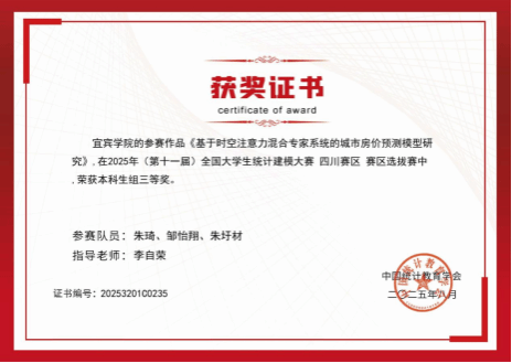 近日,由中国统计教育协会主办的全国大学生统计建模大赛省级评选结果正式揭晓。宜宾学院学子朱琦、邹怡翔、朱圩材组成的参赛团队,凭借严谨的逻辑架构、创新的建模思路与扎实的数据分析能力,项目《基于时空注意力混合专家系统的房价预测模型研究》从全省数十所高校的百余个参赛团队中脱颖而出,荣获省级三等奖,为学校赢得了荣誉。