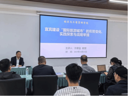 为了加快推进宜宾市“国际旅游城市”建设,明确发展路径、破解现存难题,搭建学术研讨与实践交流桥梁。宜宾学院经管学院南亚东南亚研究院于10月22日16:00在临港校区四川省哲学社科重点实验室多功能厅(鸿儒4栋309)举办《宜宾建设“国际旅游城市”的形势变化、实践探索与战略举措》专题报告。本次报告由宜宾市委党校教授、市首届干部教育名师、市乡村旅游研究会会长许察金教授主讲,钟玉锋副教授主持,我院师生积极参与。