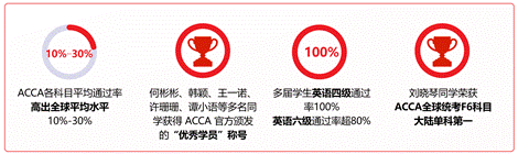 历届学生专业成绩优异,ACCA 各科目通过率,大部分均高于全球同期通过率 10%-30%;刘晓琴同学获得ACCA F6科目全国第一的好成绩,王春晖同学获得ACCA P3科目全国第二的成绩。