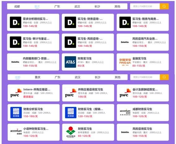 本专业携手知名人才招聘机构,每学期均为ACCA专业学子组织财经专场招聘会:汇集四大会计师事务所、大型国企和金融机构等超1000家名企,5000+热门实习与校招岗位,覆盖北上广深等全国一二线城市,精准匹配同学们职业发展需求。